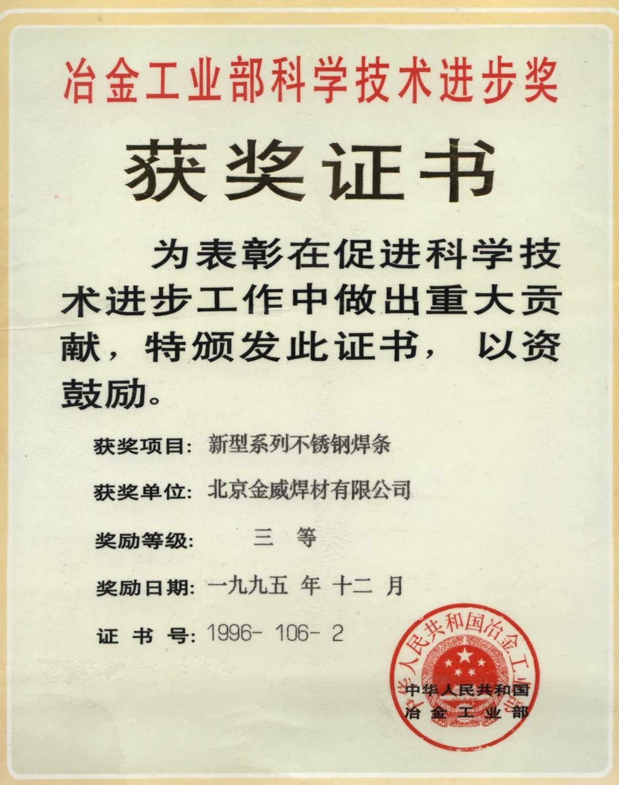 冶金工业部科学技术进步奖获奖证书